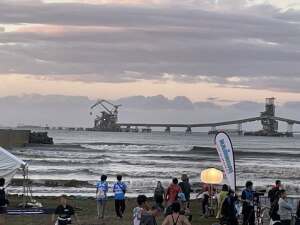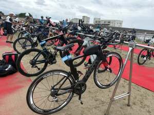 スイムは前日からの荒天のせいでめちゃくちゃ波が高く、こりゃサーフィン日和やねというようなコンディションの中、ノリノリで海に向かっていく選手たちにまずはドン引き😅高波でコースの目標となるブイが見えず、またブイすらも流されてどこをどう泳いでよいか分からず苦戦しました😅行きはヨイヨイ、帰りは怖いで、陸に向かう時に、引き潮で全く進まず、陸が遠い😅まずはアイアンマンの洗礼を受けました。スイムは1時間33分と遅いなりに何とか想定内で終えました。